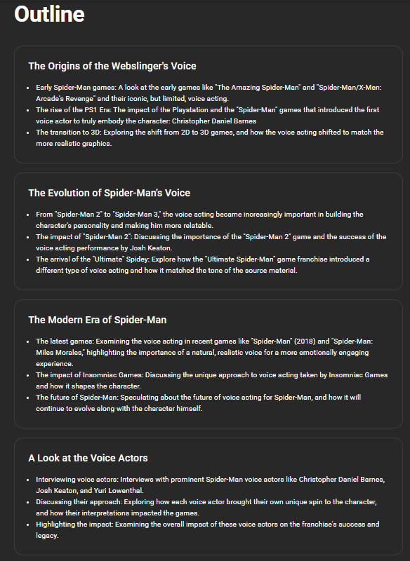 Suggested video outlines are also a trip. YouTube asked games writer and hobbyist YouTuber Chris Baker to take a walk down memory lane and hark back to all the “iconic” voice acting of Spider-Man games from the days before games really had voice acting: