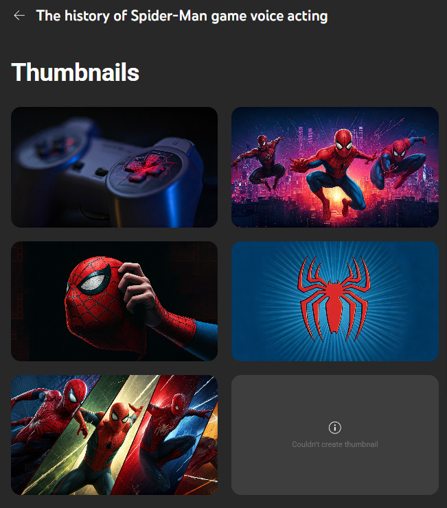 Baker’s AI-generated thumbnails – one of which seems to depict Spider-Man using his hand like a phone or perhaps Spider-Man yanking his own head off – are also really something: