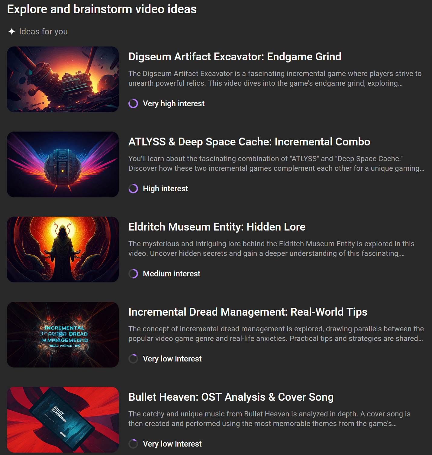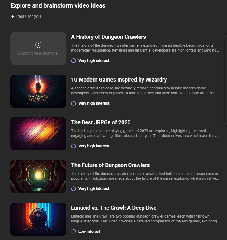 Before we get into more suggestions YouTubers have shared with Aftermath, I want to point out what I feel is the funniest part of this whole thing: Each YouTube-generated video idea is also rated in terms of potential audience interest. The above two suggestions, given to Polygon’s Simone de Rochefort, are considered “very low interest” and “low interest,” respectively. Most suggestions I’ve come across so far, in fact, have been dubbed total snoozers by the system itself. Why would anybody use this?