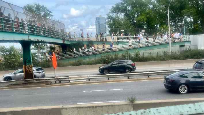 When we got to the track, there was another crush of people waiting for the pedestrian overpass, but things were pretty orderly despite the crowd. We got our next clue: “We disagree with this former mayor on most things, but we’re happy to be in the same boat with him on free public transit. Meet us outside this Manhattan terminal where you’ll find the City’s shining example of free transit.”