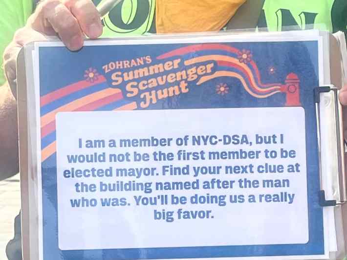 But for me, it was a nice way to be outside and see friends, to learn some things about the city while reconnecting with the pleasures of just exploring it. A scavenger hunt doesn’t say much about how Mamdani would lead the city, but it did bring his supporters together to have a good time with each other and get his name out there to onlookers. That the turnout was so big for something with little warning, at a time when the city is traditionally empty, is another reminder of the popularity of his campaign. We’ll see how that momentum carries through to November’s mayoral election.