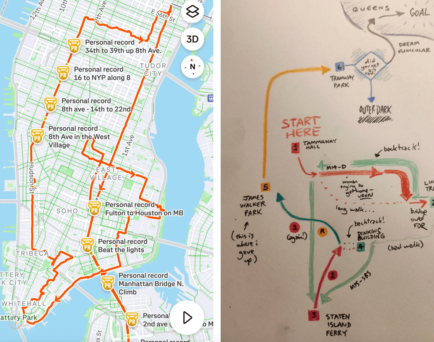 As a game–if a scavenger hunt can be called a game–the need to Google some of the deeper-cut clues (Autumn overheard one participant in Union Square saying they’d used Chat-GPT to get the Tammany Hall answer) wasn’t always the most fun way to puzzle something out, though hardcore NYC history nerds might have been better at solving things on their own. Not being able to get to the end despite solving all the clues in time because I hadn’t arrived long before the event even started was also a bit of a bummer, and I can imagine feeling that letdown more strongly if I’d been spending money on travel fare or dealing with Sunday train schedules to take part. In that regard, the routing could have been more efficient; Jeanne drew me what she called an “angry map” of her experience on transit, which stood in contrast to my bike route: